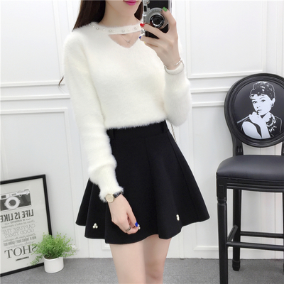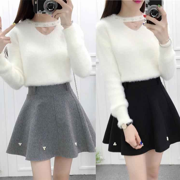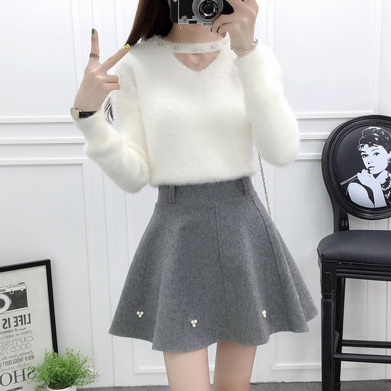 Color:white sweater + gray skirt.white sweater + black skirt.